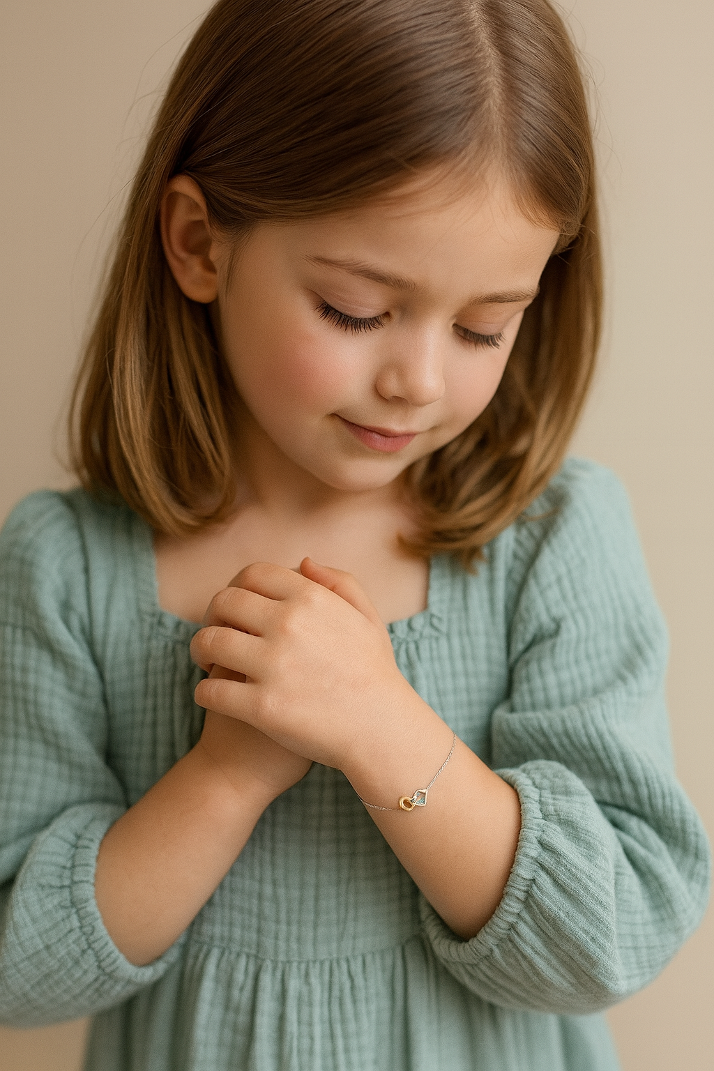 This TwinTone Heart link bracelet showcases the refined contrast of 9kt yellow and white gold. Each heart link is meticulously designed to capture light beautifully on a child's wrist. At approximately 18.5cm, it strikes the perfect balance between elegance and comfort. An heirloom-worthy piece that transforms everyday moments into cherished memories.